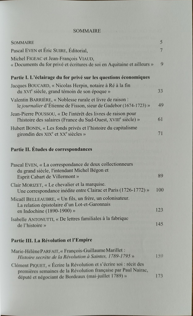 Ce Tome est dédié aux actes du congrès sur les « Documents du for privé et écritures de soi en Aquitaine et ailleurs » organisé par la Fédération et la Société des Archives en octobre 2024. Les thèmes abordés sont l'éclairage du for privé sur les questions économiques, les études de correspondances, la Révolution et l'Empire, Religion et spiritualité, Trajectoires individuelles et familiales au prisme du for privé, et enfin Voyages, villégiature et loisirs.
