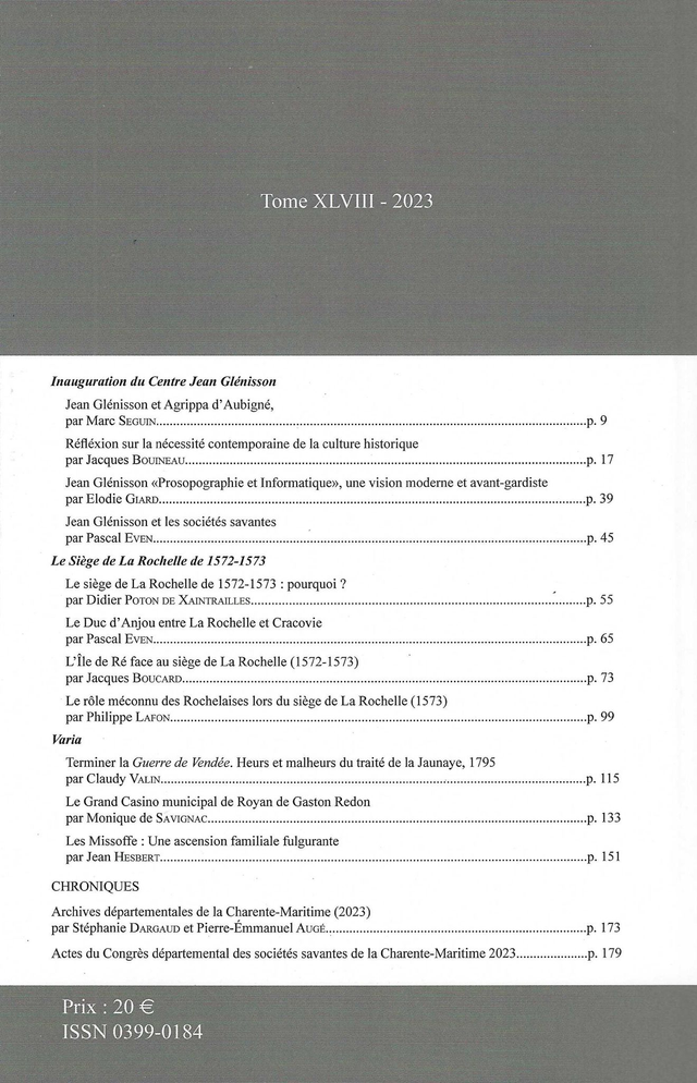 Ce Tome rend hommage dans une première partie à Jean Glénisson, un érudit qui a marqué la Saintonge. Dans une deuxième partie, quatre articles sont consacrés au siège de La Rochelle 1572-1573. Enfin les Varia proposent un sujet sur le Grand Casino municipal de Royan de Gaston Redon, un autre sur Les Missoffe, une ascension familiale fulgurante, ainsi qu'un article sur la Guerre de Vendée.